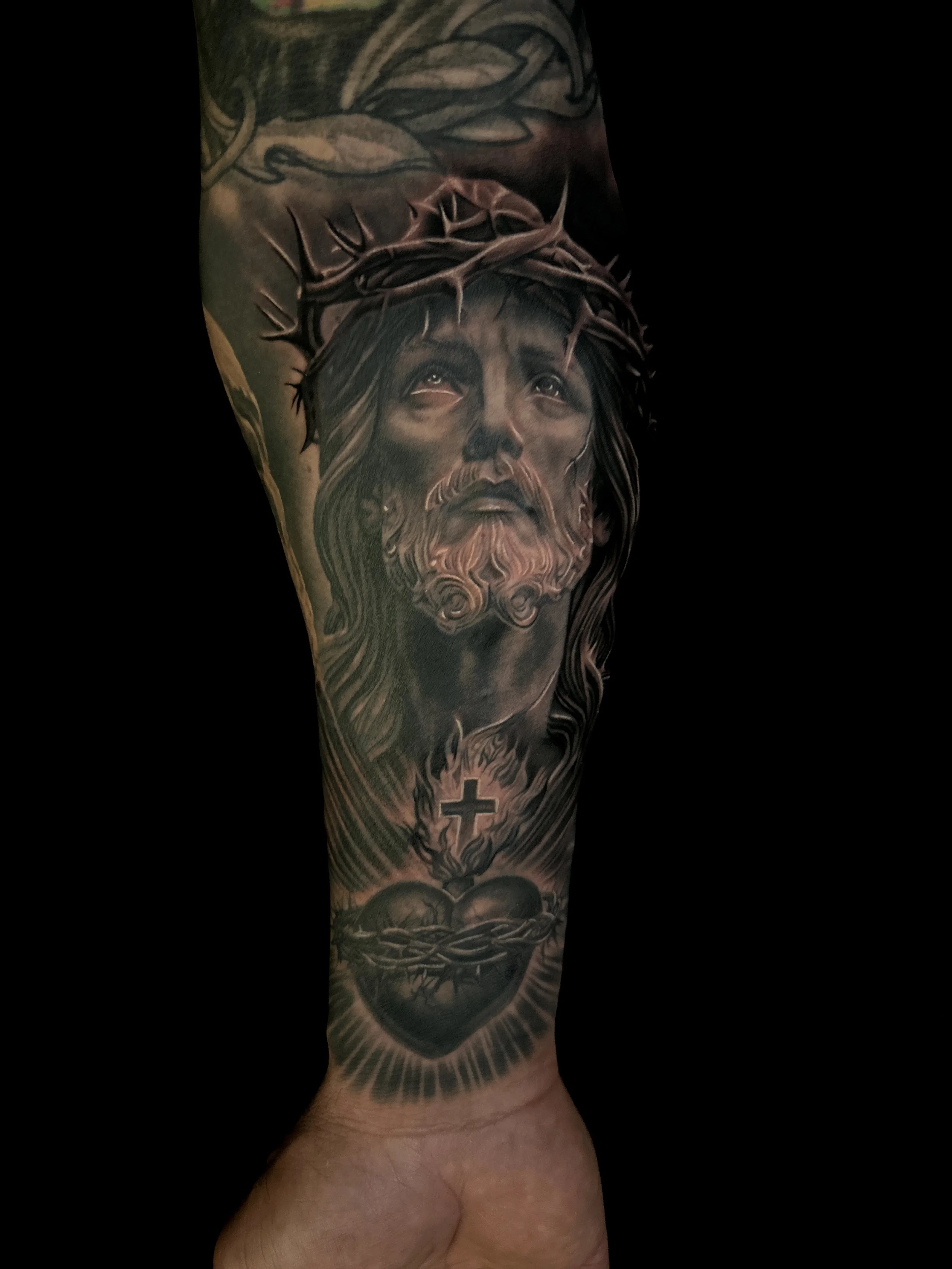 Tattoo of Jesus Christ wearing a crown of thorns with a glowing heart underneath, wrapped with a cross, on a person's arm.