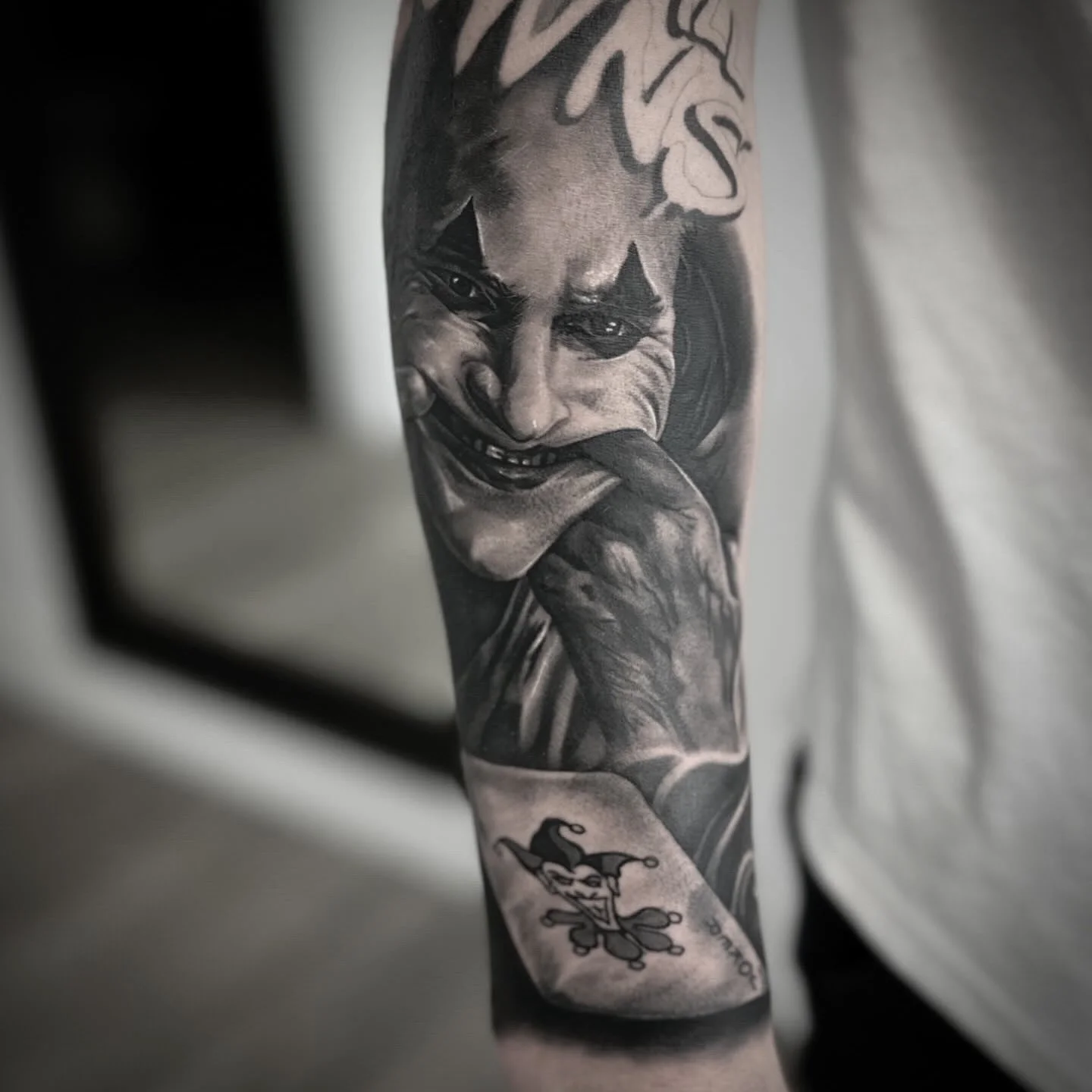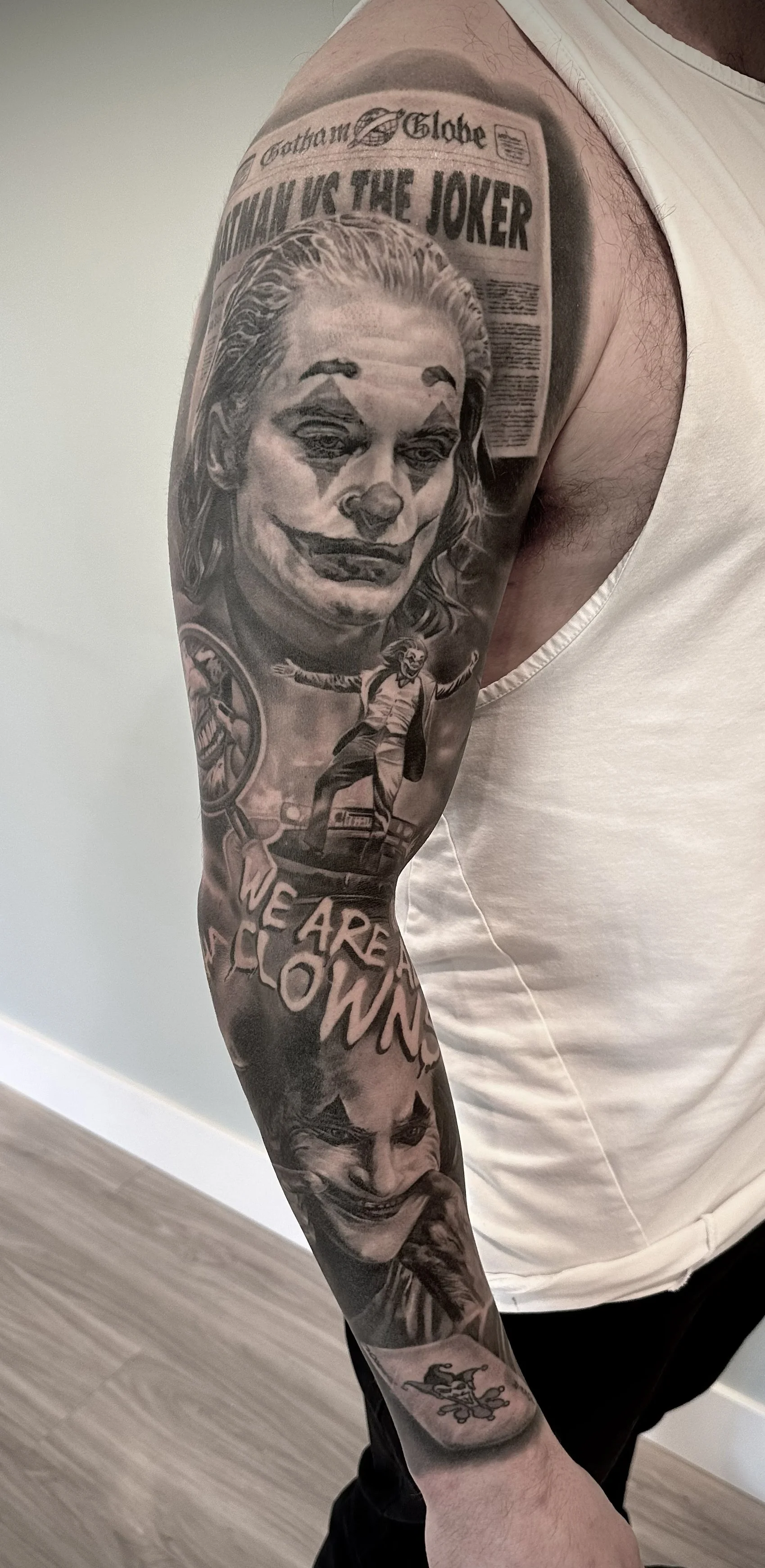A detailed black and gray tattoo sleeve featuring a portrait of the Joker, a person in clown makeup, the phrase "We Are Clowns," a man with rolled-up sleeves, and a small lion tattoo near the wrist.