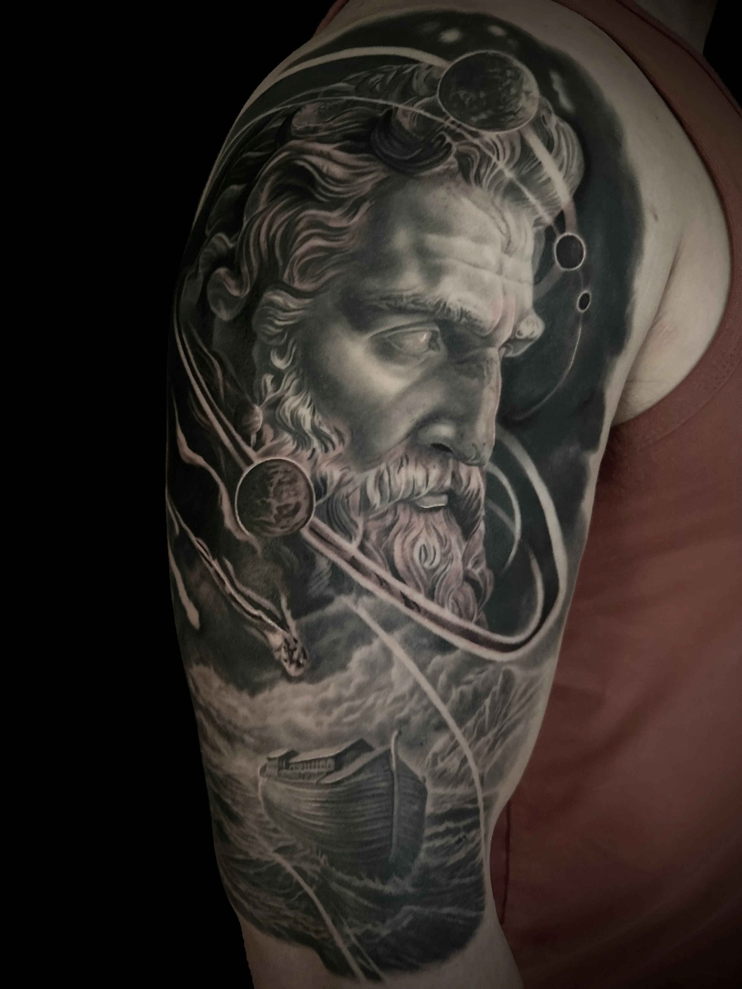 A person with a black tank top has a detailed black and gray tattoo of a classical statue of a bearded man on their upper arm.