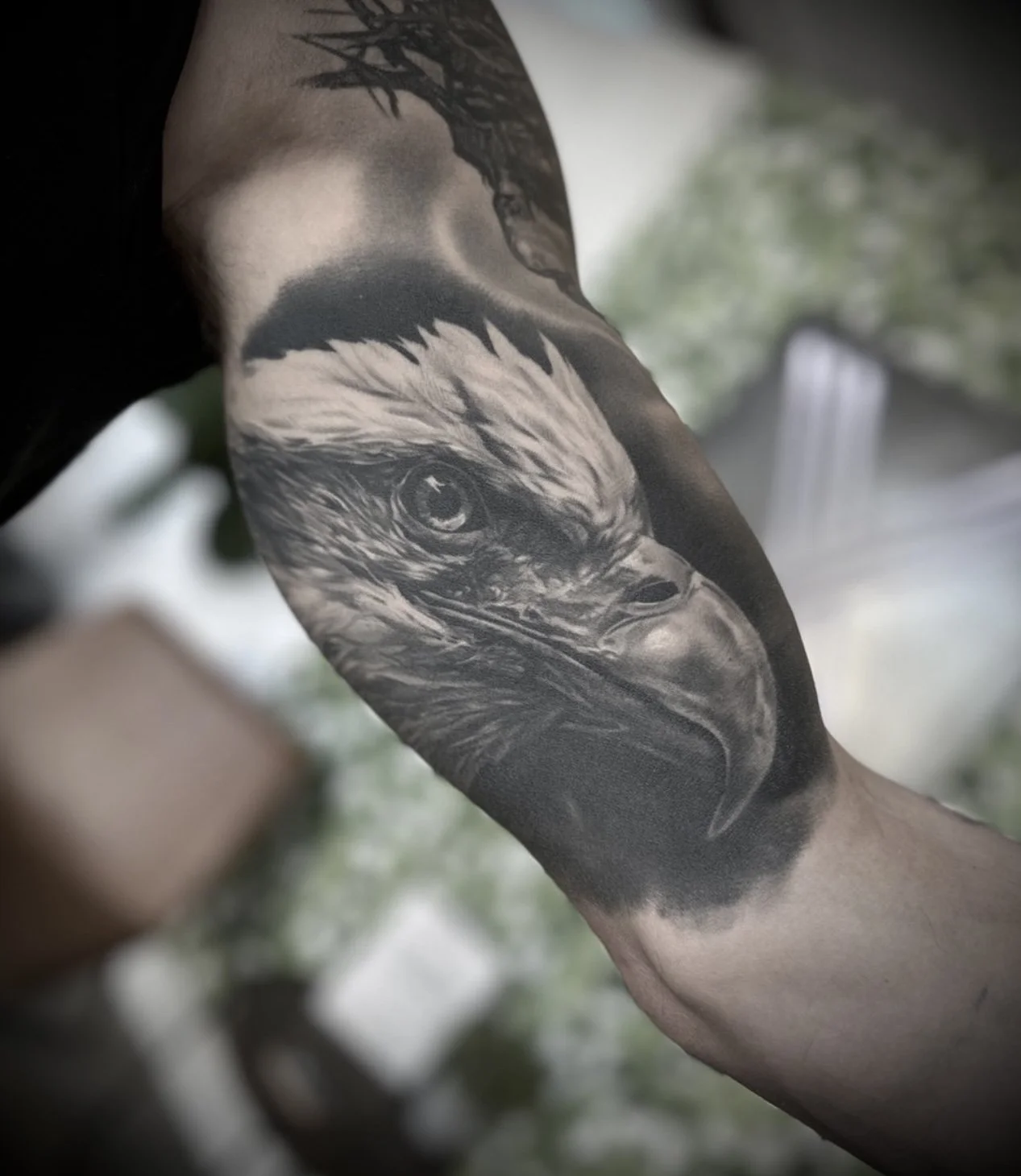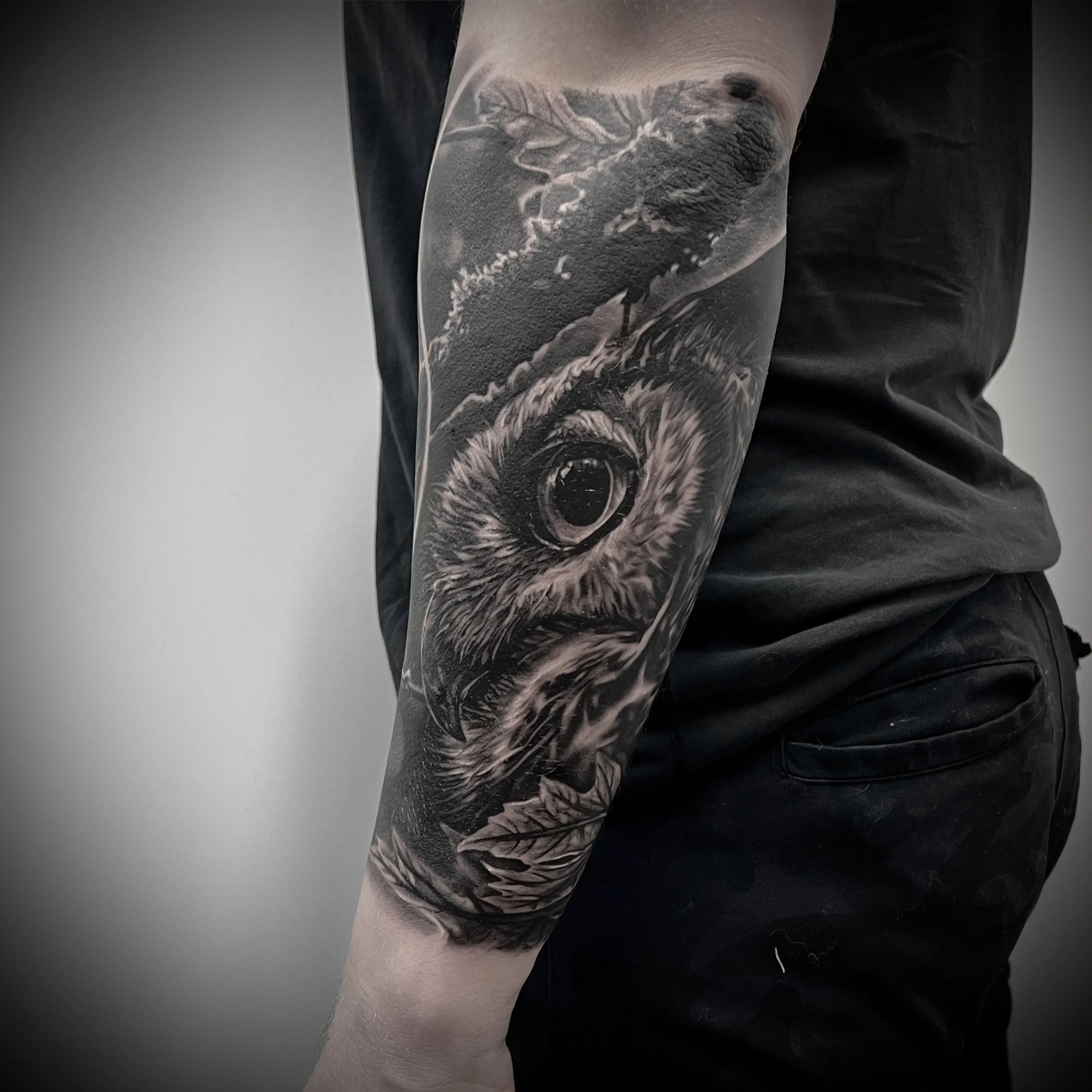 Black and gray tattoo of an owl's face on a person's arm, with intricate details and feathers.