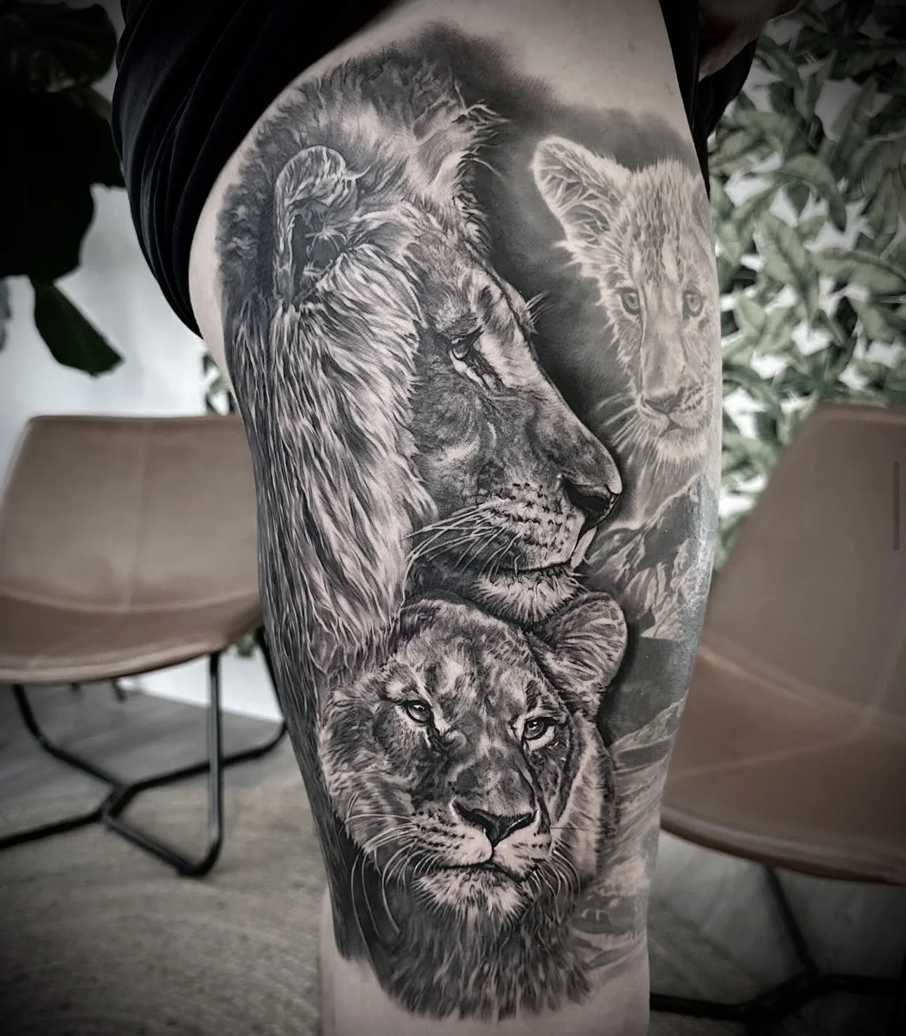 Black and gray realistic tattoo of lion, lioness, and lion cub on person's thigh.